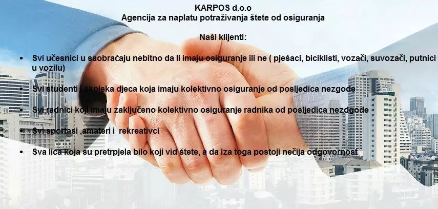 Ako vam treba pomoć pri naplati od osiguranja bilo da se radi o materijalnoj ili nematerijalnoj šteti a ne znate kako da ostvarite svoja prava, bojite se nepravedne isplate osigurane sume i ne želite da čekate godinama da se naplatite, želite da izbjegnete troškove plaćanja advokata ili pristarsnih vještačenja angažovanih od strane osiguranja, onda ste na pravom mjestu jer smo mi specializovana Agencija za naplatu potraživanja od osiguravajućih kuća koja brzo i profesionalno napravi vezu izmedu oštećenog i odgovornih za isplatu štete (tj. od osiguravajućih kuća ), te organizujemo cjelokupni postupak potraživanja nankade štete za oštećenika počev od procjene štete od strane sudskih vještaka i pravnog osnova, obračuna štete i konačno postavljanja odštetnog zahtjeva prema odgovornima.